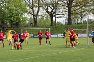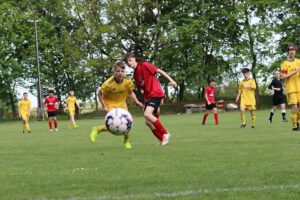 „Tobi tut der Mannschaft gut!“ So könnte die Überschrift über die Erfolgsgeschichte der C1-Junioren lauten. Nach dem Einzug ins Pokal-Halbfinale setzen die Junioren mit einem 3:0 gegen SG Handwerk Rabenstein 2 ihre kleine Serie fort. Auf heimischen Rasen wollten die Jungs die vermeidbare 0:2- Pleite aus der Hinrunde wieder gut machen. Auch wenn Handwerk Rabenstein 2 momentan in der oberen Tabellenhälfte steht, so sollte das Hinspiel Warnung genug sein, dass ein „Unterschätzen des Gegners“ in einer Niederlage münden kann. Das Team startete mit einer gewohnten Besetzung. Unsere C1 spielte wesentlich stabiler als noch im Hinspiel und konnte sich von Anbeginn leichte Feldvorteile erarbeiten. Jedoch verpassten sie es, wie schon zu oft, sich mit einem erfolgreichen Torabschluss zu belohnen und so glänzte einige Male ein stark aufgelegter Torwart von Handwerk Rabenstein 2. Mit einem 0:0 ging es in die Kabinen. In der 41. Minute erhielt Torhüter Jannik nach einem Foulspiel die gelbe Karte und Elfmeter für die Gäste. Jannik vereitelte souverän und hielt unsere Jungs weiter im Spiel. In der 58. Spielminute dann endlich die erlösende Führung durch David. Einen Freistoß konnte Colin in der Nachspielzeit zum 2:0 verwandeln und Kian setzte mit seinem Tor den Schlusspunkt unter diese Begegnung. Eine starke kämpferische Mannschaftsleistung brachte den zweiten Saisonerfolg.