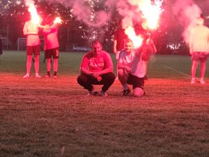 Nach der Niederlage ließen sich die C1-Junioren den Saisonabschluss nicht versauern. Es wurde mit allen Spielern ausgiebig gefeiert und die Trainer bekamen eine tolle Pyroeinlage geboten. Der Dank geht raus an die Abteilungsleitung und an Platzwart Bernd für die tolle Übernachtungsmöglichkeit.