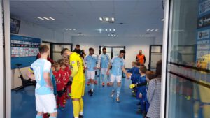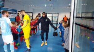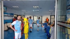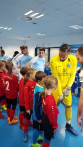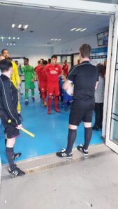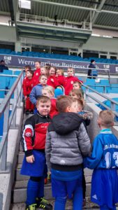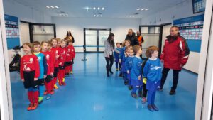 Danach ging es zurück in den Einlaufbereich des Stadions, wo die Kinder das geschäftige Treiben bei der Aufstellung der Mannschaften und der Schiedsrichter miterleben konnten.